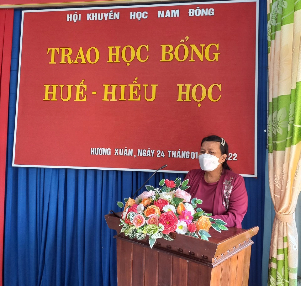 Bà Hoàng Thị Sương phát biểu tại buổi trao học bổng "Huế - Hiếu học" tại xã Hương Xuân, huyện Nam Đông. Ảnh: NVCC